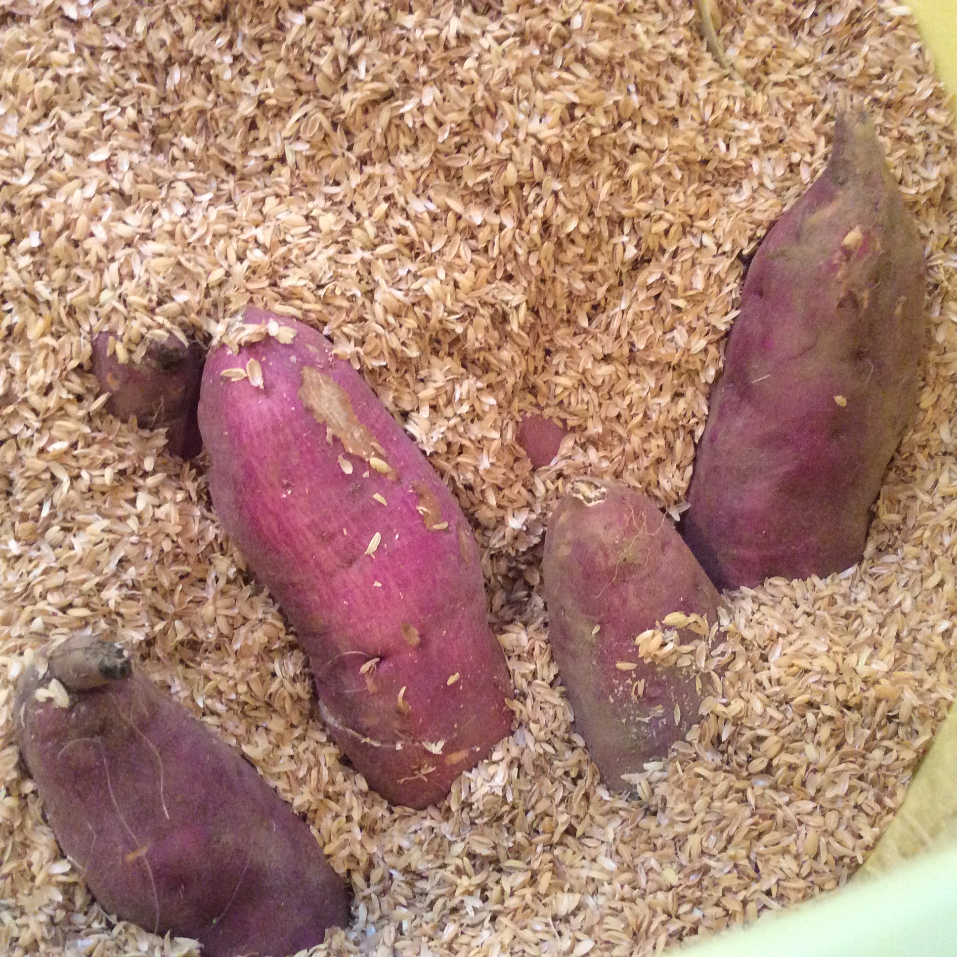 ここ千葉ではさつまいもの保存するのに樽に籾殻をいれてさつまいもを立てて詰めてハウスで保存します。